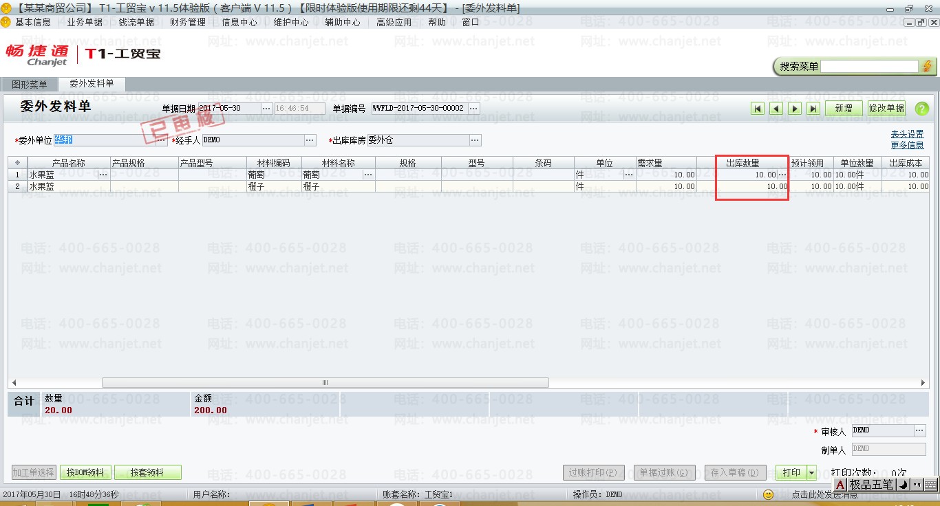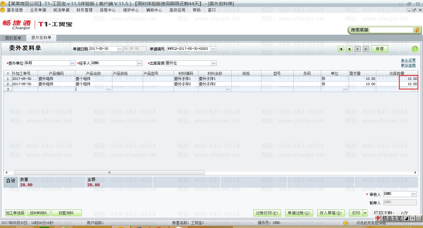 (3)根据委外加工单,生成委外发料单,【业务单据】-【委外业务】-【委外发料单】