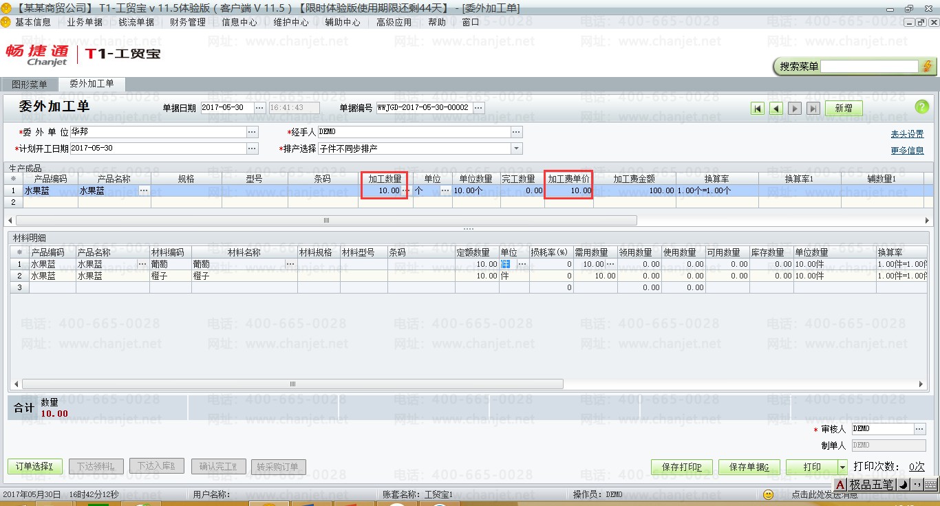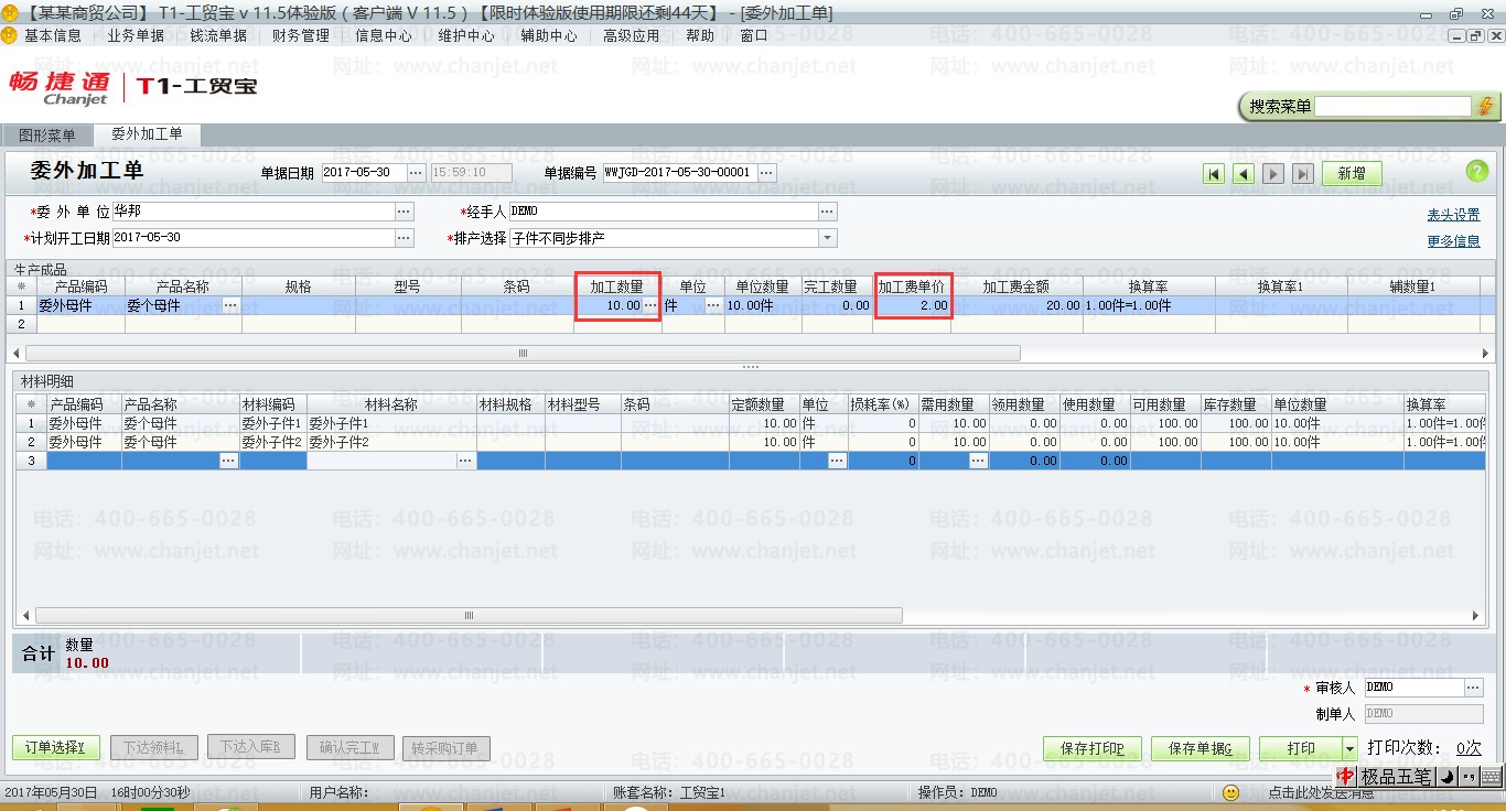 (2)填制一张委外加工单,【业务单据】-【委外业务】-【委外加工单】加工数量为10个,加工费为2元。