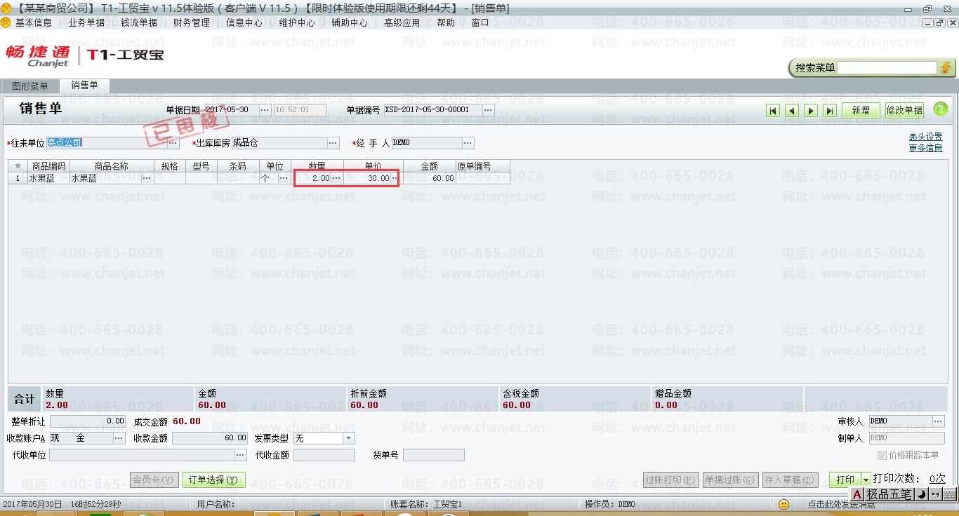 (2)由于业务场景二,已经销售了二个水果蓝,所以再次销售八个,填制销售单。