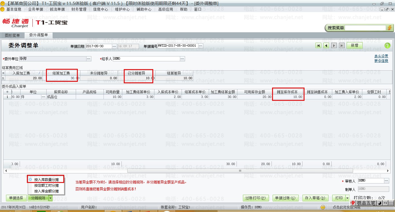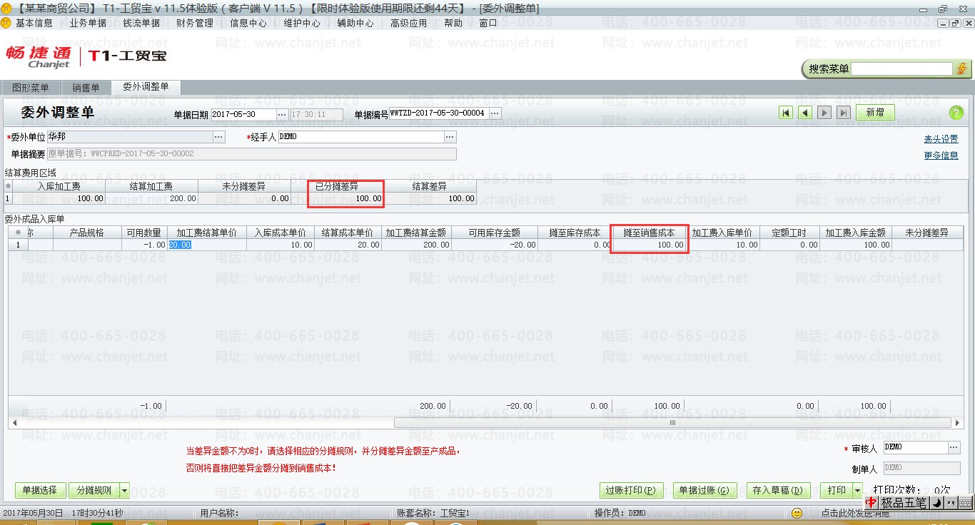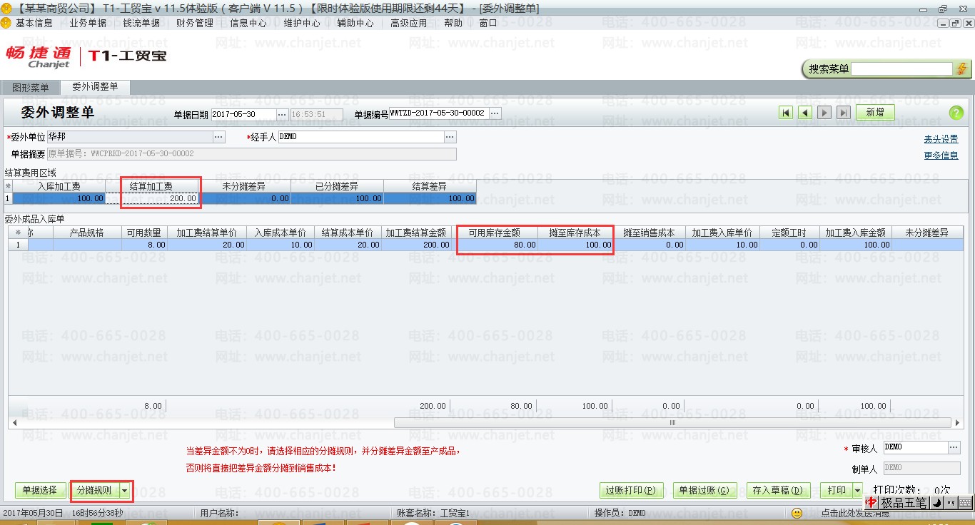 3. 委外调整单中有差异金额时,如果没有手工点分摊规则中的【按入库数量分摊】、【按定额工时分摊】还是【按入库金额分摊】,则软件默认会分摊至销售成本去。