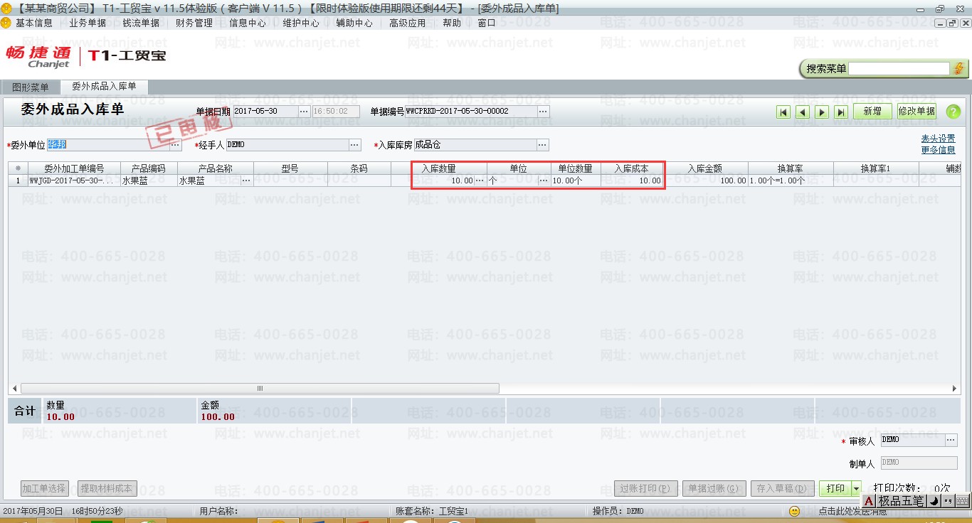 (4)委外加工商加工完毕后,把货物发回来,填制委外产成品入库单