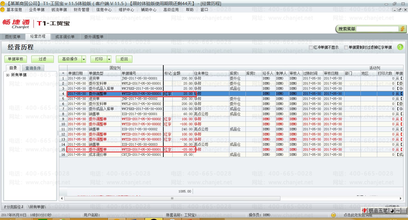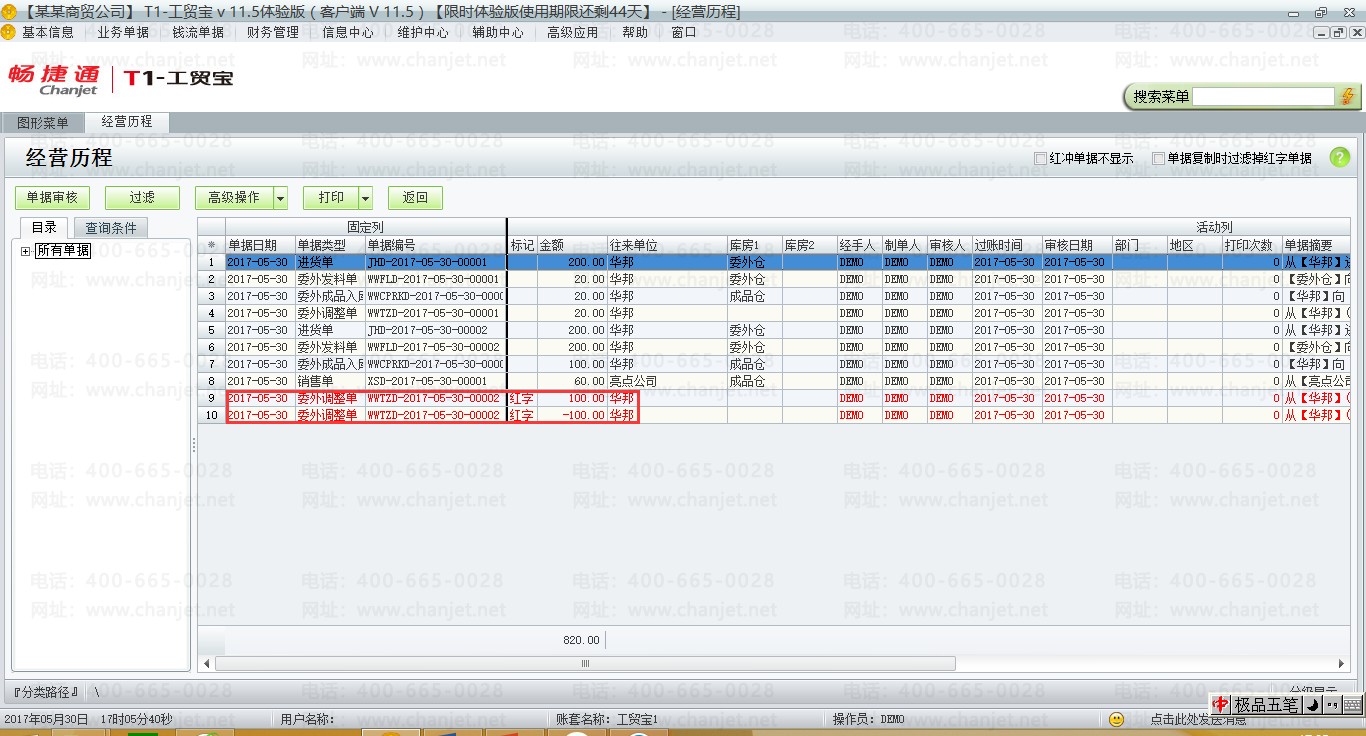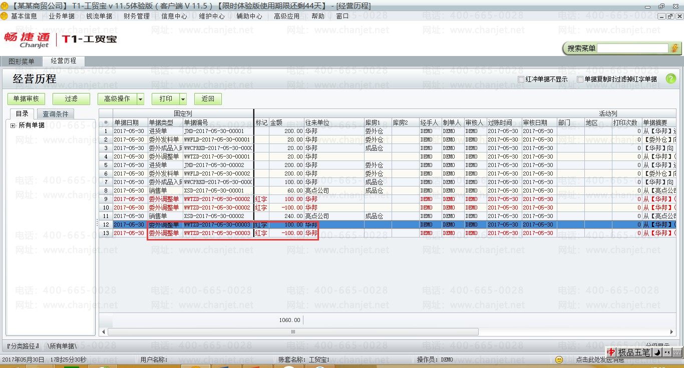 (1)在业务场景一的基础上,把委外调整单红冲。