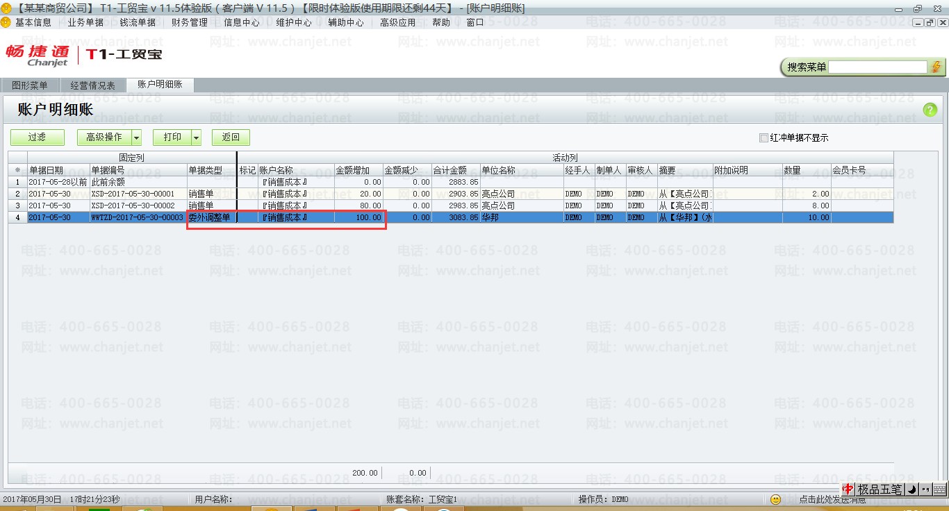 (4)【信息中心】-【经营分析】-【经营情况统计表】-【相关统计】-【明细查询】可以看出销售成本增加了100元。