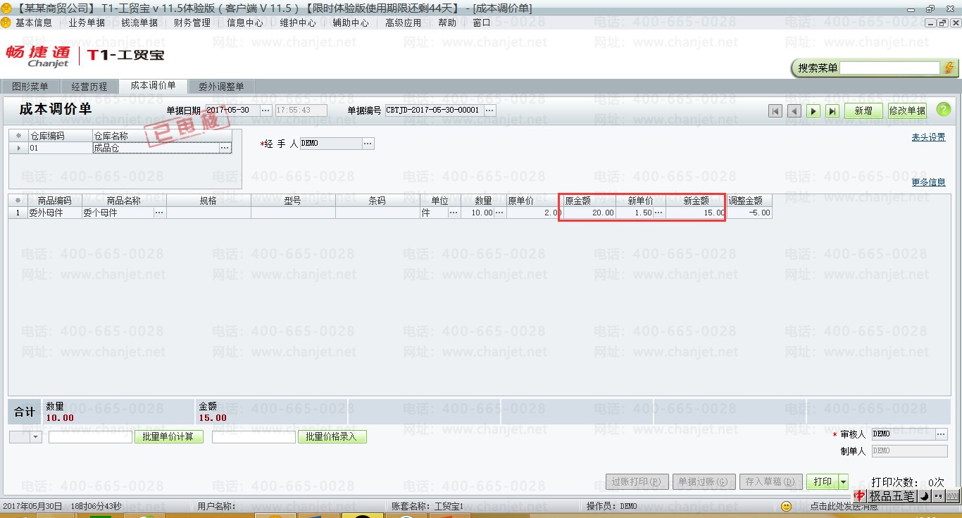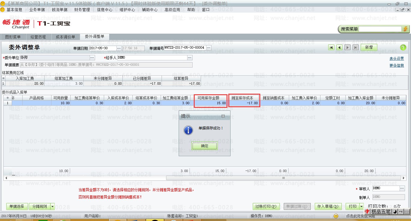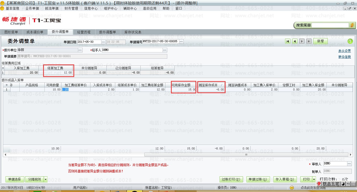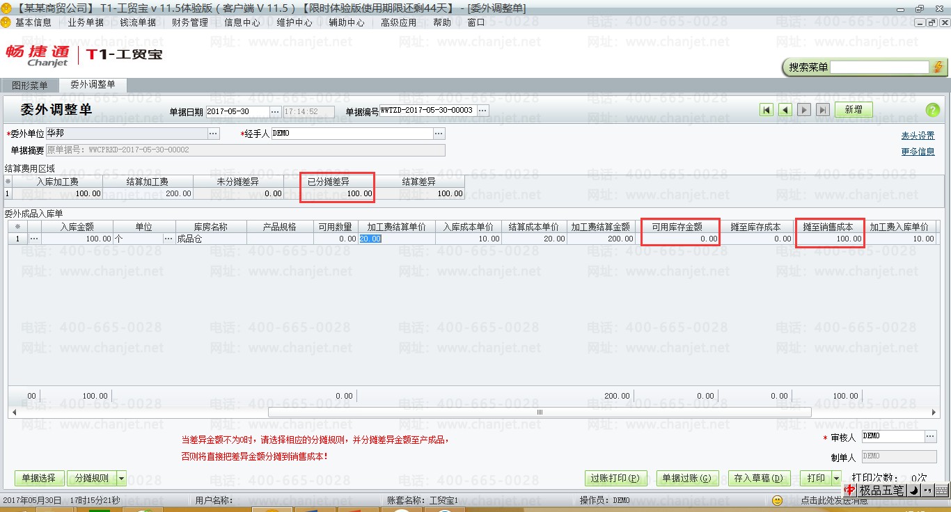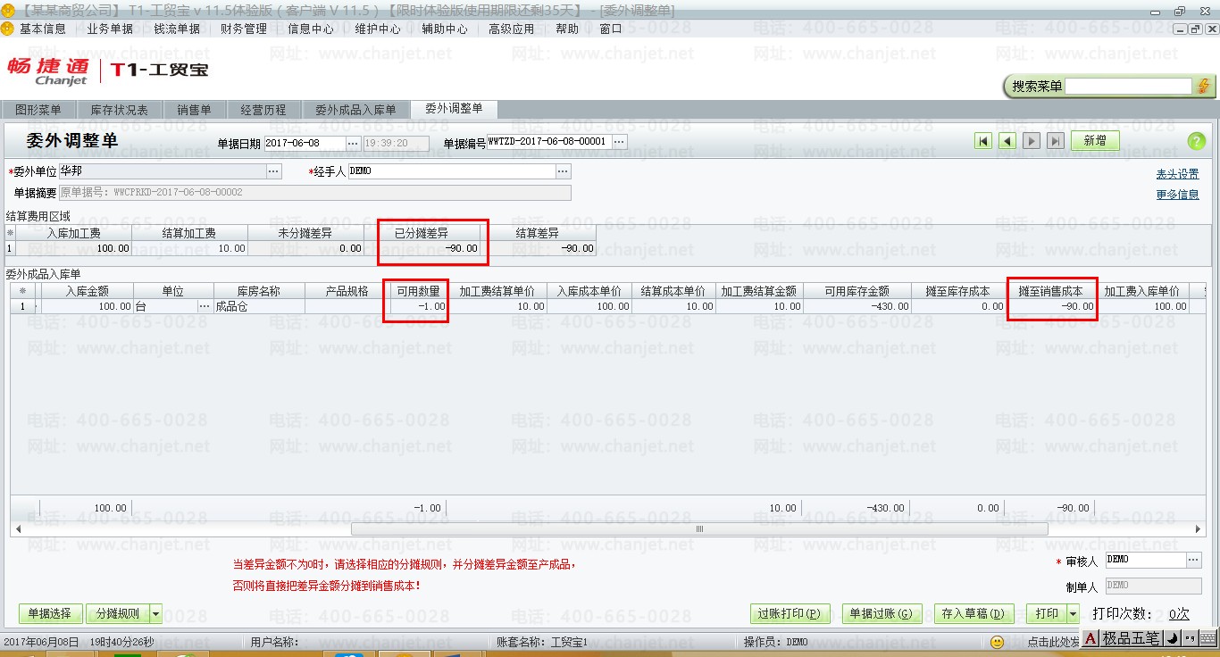 (4)月底,委外供应商开具委外发票,填制委外调整单,从下图可以看出,当可用数量小于零时,则所有的差异金额全部分摊至销售成本。