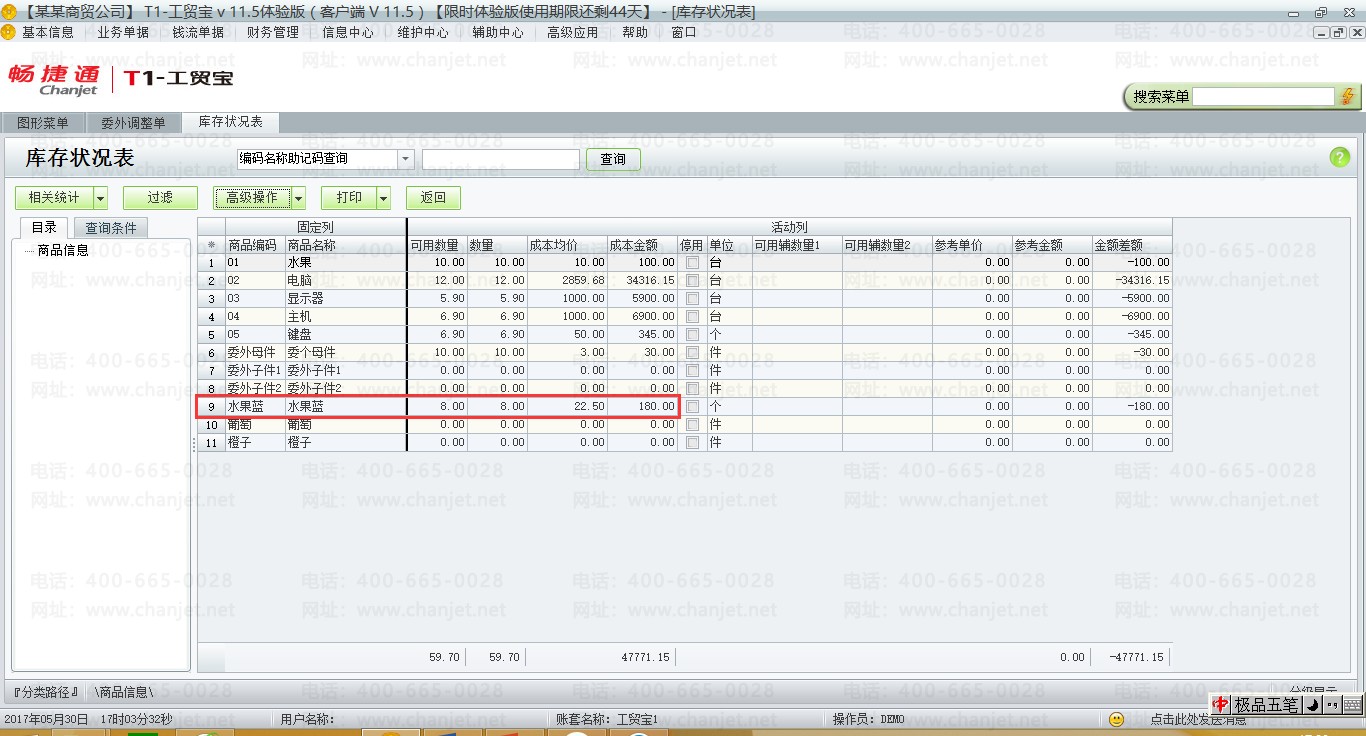 查看【信息中心】-【库存信息】-【库存状况表】,可以看出此存货结存金额为30元。