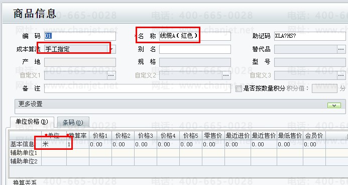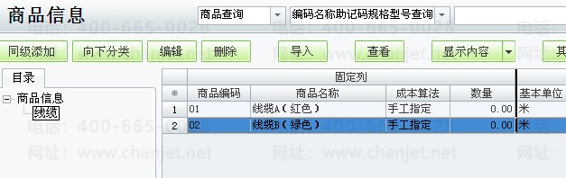 1、建立不同颜色的线缆商品档案,商品的成本算法选择“手工指定”,计量单位设置为“米”;