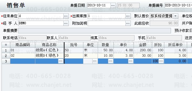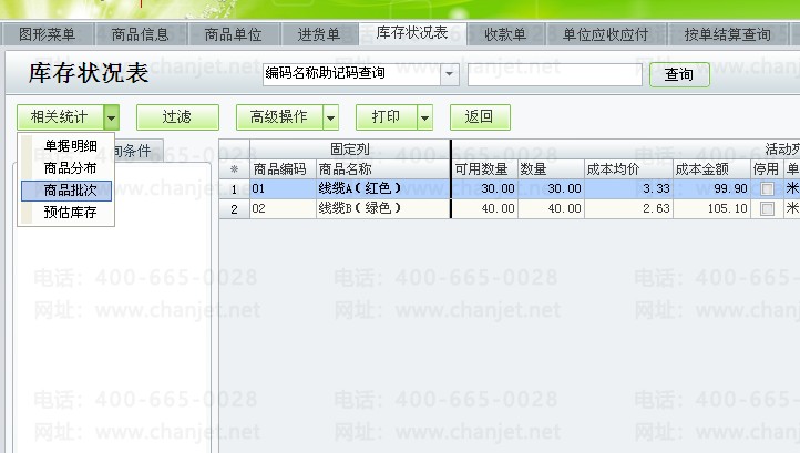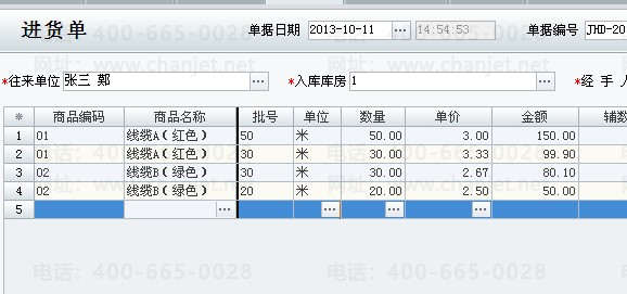 3、进货时使用批号标识不同规格商品,以批号表示不同长度规格的商品,比如进货,线缆A(红色),50米的1卷,30米的1卷;线缆B(绿色),30米的1卷,20米的1卷;如下图,其中商品线缆A(红色),批号50,录入数量50,单价3,表示一卷50米的线缆A(红色);
