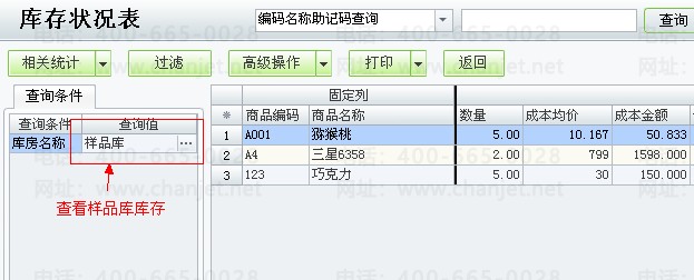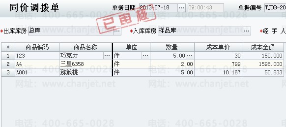 二、业务员从正常仓库中提走样品,那么可以做同价调拨单将商品调拨到样品库。这样既减少了正常销售仓库的库存,也可以管理到样品的库存。