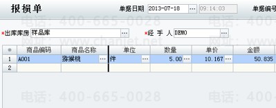 Ø 样品的报损:例如某新品种猕猴桃作为样品用来提供给客户试吃,总共发出五箱。试吃后商品消耗掉了,可以做报损单。
