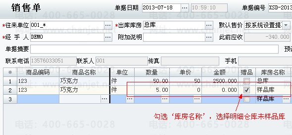 注:若是以后要根据仓库来查询销售方面的情况,例如查询一段时间某仓库的销售,或是一段时间某仓库商品进销存变动,那么若是直接从样品库销售出库,按照仓库查询数据时就不能包含该仓库的数据。这时可以先做一张同价调拨单从样品库把需要销售的商品调拨回总库,再从总库中做销售单。