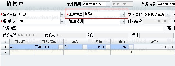 Ø 样品的销售:例如三星手机提供给客户试用,试用一段时间若客户满意就直接购买此手机,那么可以做销售单,出库库房选择样品库。