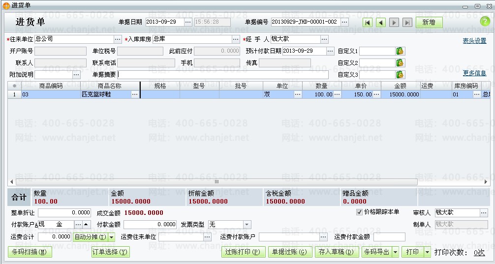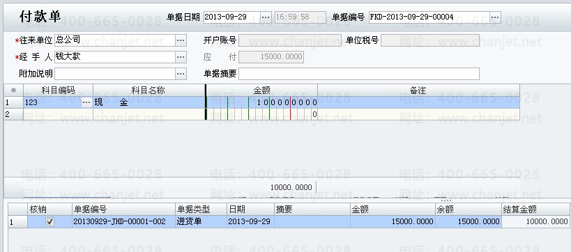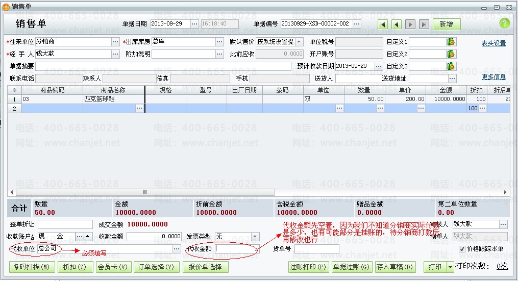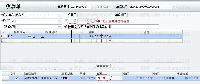 二、向分销商发货,分销商拿到货后结算,货款直接打给总公司, 由于我们并不知道分销商实际付款金额,所以代收单位的代收金额,我们可以不录,但是代收单位一定要选“总公司”,这样才能补录代收金额。