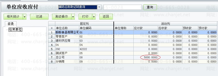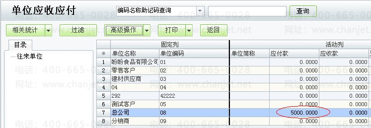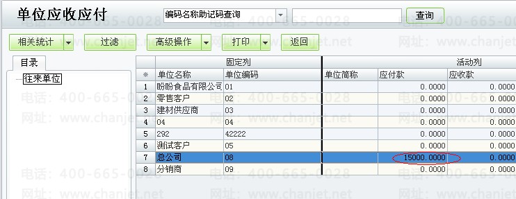 那么此时分销商欠款实际上已完全支付,取而代之的是“总公司”欠张女士10000元,此外由于张女士之前在“总公司”拿了15000元的货没有结算,所以张女士还欠“总公司”5000元。查询单位应收应付如图