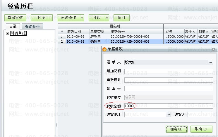 比如现在客户全额付款给“总公司”,那么我们在经营历程中找到销售单,点击单据修改,在代收金额处录入实付金额。