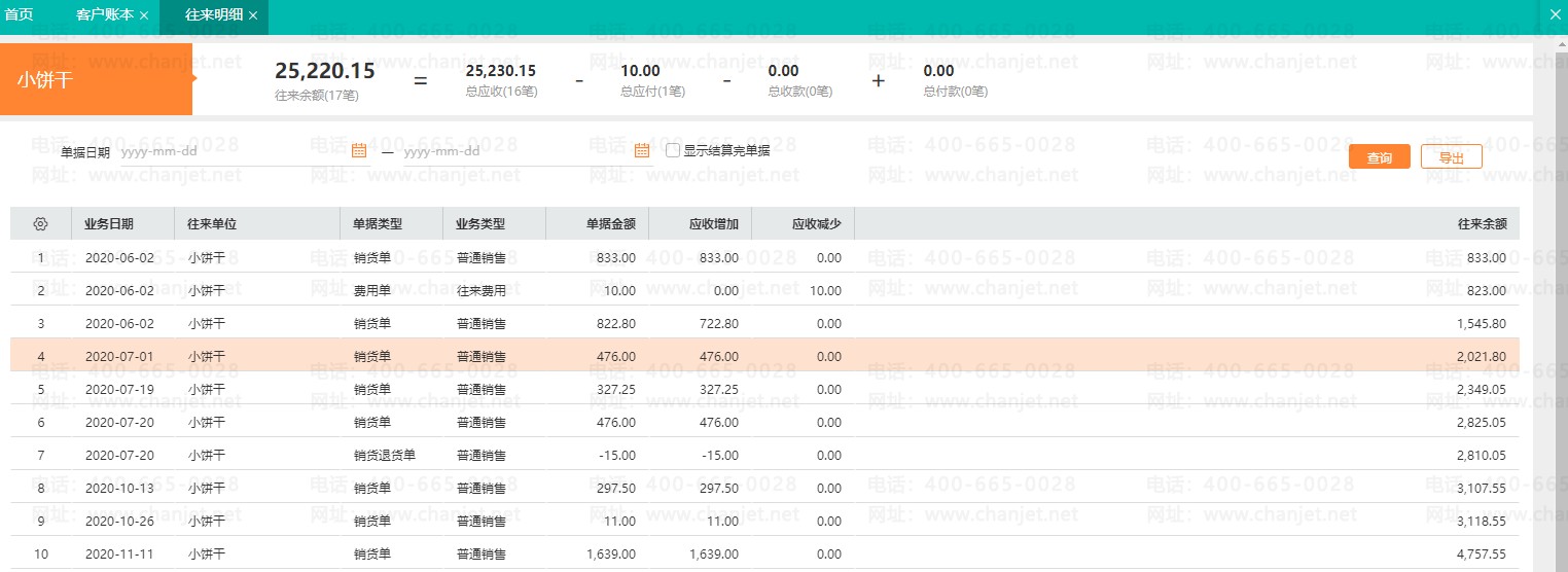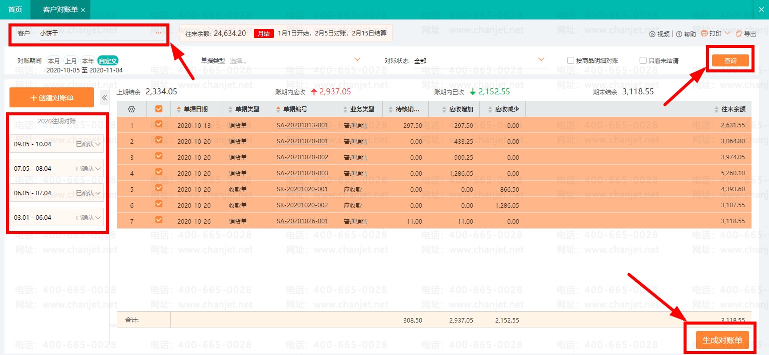 ①点击【好生意】-【资金管理】-【客户对账单】,选择需要对账的客户,客户的账期会自动给出当前需要对账的期间范围,点击查询,好生意会将当前期间内需要对账单据显示出来。