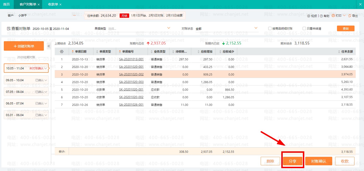 ②点击【生成对账单】后,可以将对账单分享给客户,客户打开就能直接查看对账结果;