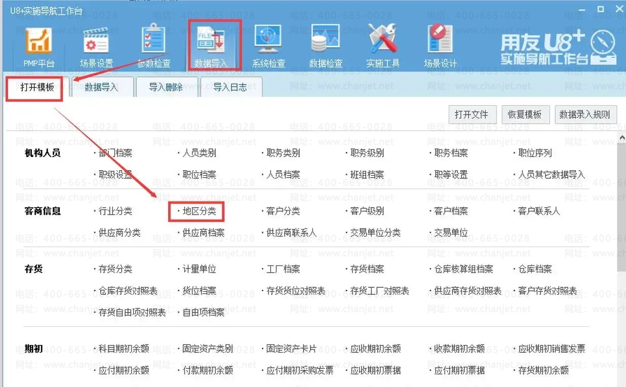 1、【实施导航-数据导入-打开模板-地区分类】打开模板。