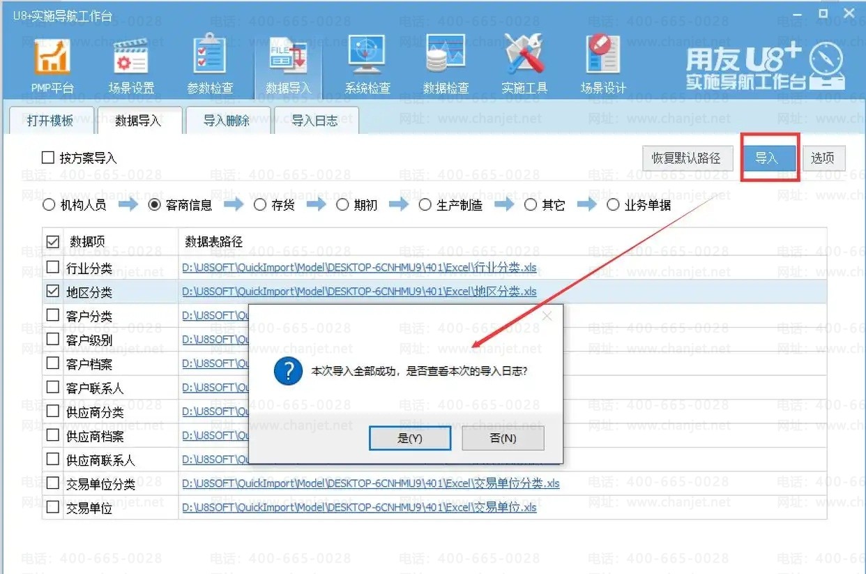 3、在【实施导航-数据导入-数据导入-客商信息-地区分类】导入。新增地区分类时,选项的导入方式选择“追加”;修改已有的地区分类时,可以使用覆盖导入。不支持差异更新、清空导入。