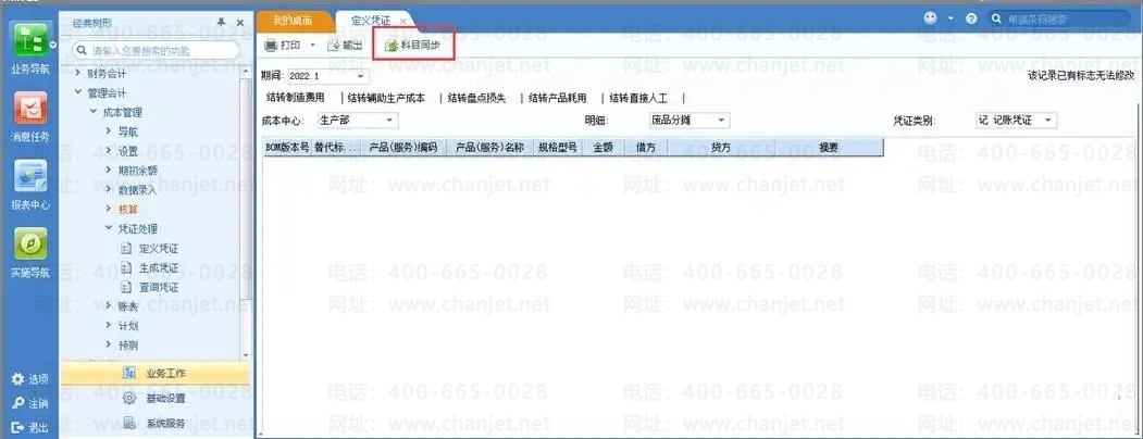 3、【成本管理】-【凭证处理】-【定义凭证】,点“科目同步”