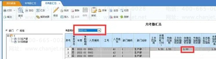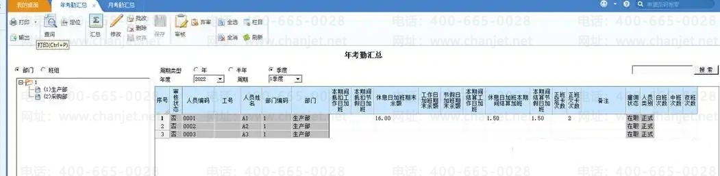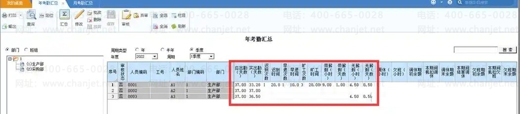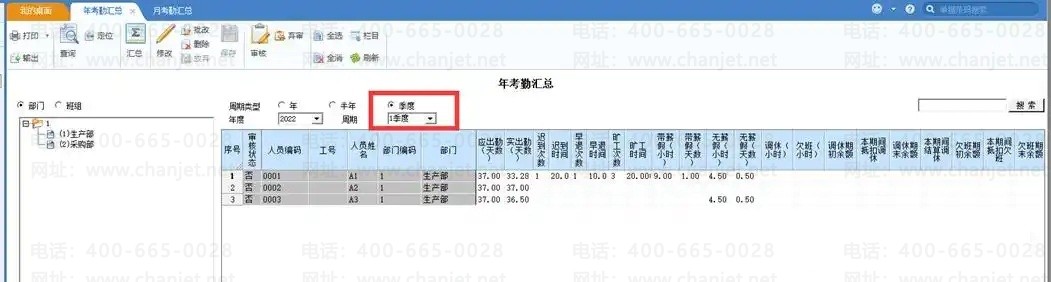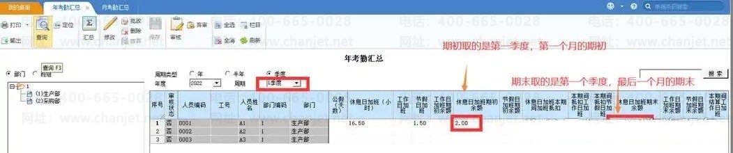 如查询第一季度A1人员的迟到、早退,加班、请假等数据可以直接到查看月考勤汇总2022-01、2022-02、2022-03三个考勤期间的月考勤汇总数据