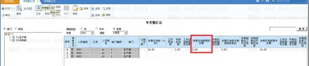 【数据处理】-【年考勤汇总】,点“修改”,如修改A2的调休(小时)为20,点“保存”