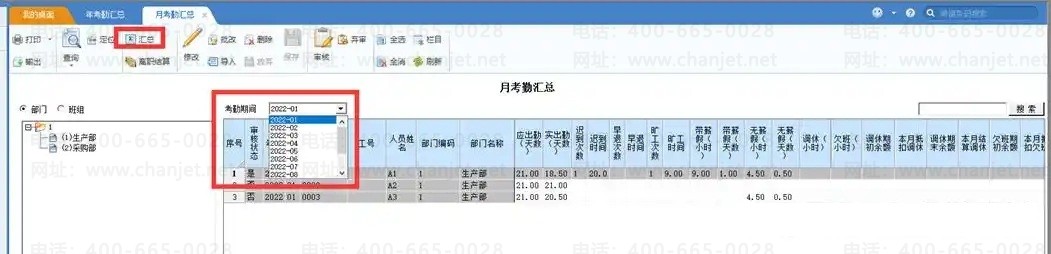 1、【数据处理】-【月考勤汇总】,按月份先后顺序,进行汇总