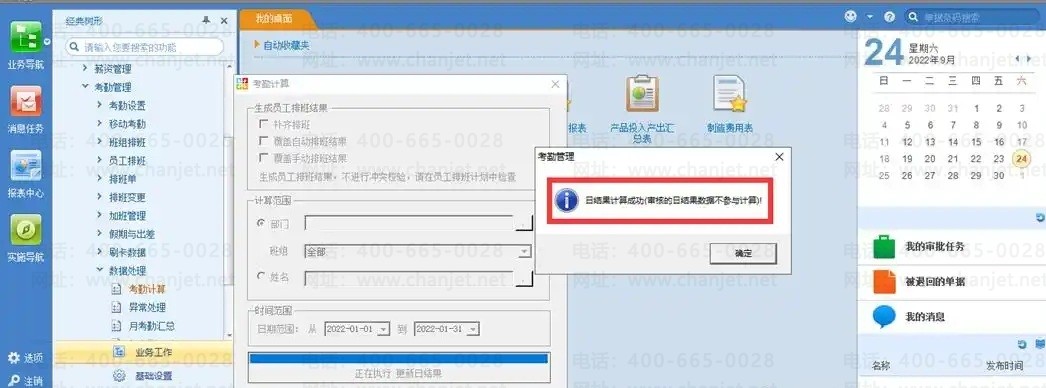 1、【数据处理】-【考勤计算】,选择计算范围和计算时间(选择本月),点“确定”,弹出提示:“日结果计算成功”