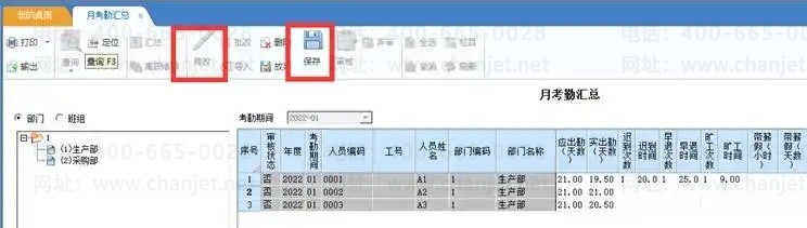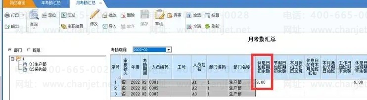【数据处理】-【月考勤汇总】,点“修改”,如修改A2的调休期末余额为10,点“保存”