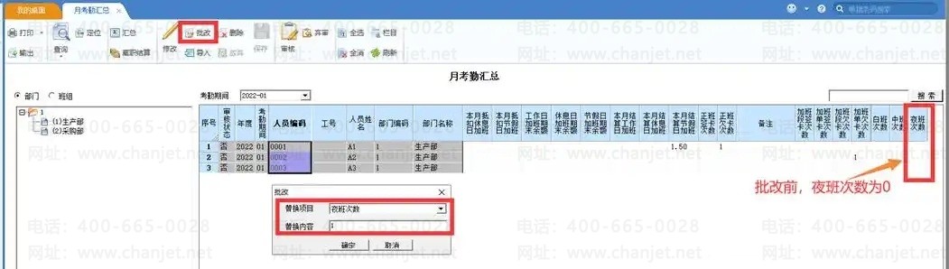 【数据处理】-【月考勤汇总】,选择需要修改的人员,点“批改”,选择要替换的项目和替换的内容