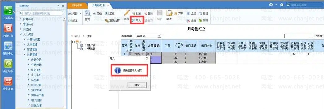 A、【数据处理】-【月考勤汇总】,点“导入”,弹出提示“请先建立导入方案”,点“确定”