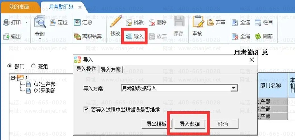 G、【数据处理】-【月考勤汇总】,点“导入”,弹出导入界面,选择“导入操作”页签,点“导入数据”导入数据,选择导入模板,点“打开”