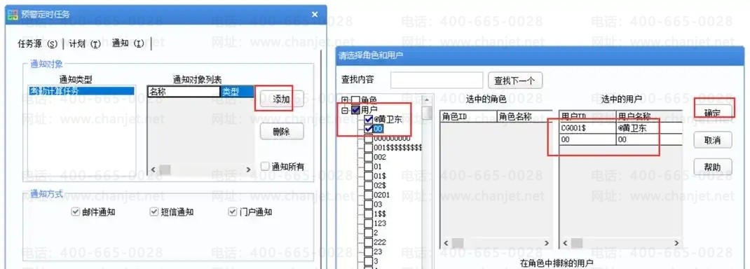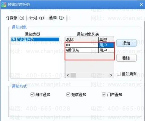 b) 通知对象列表:按〖添加〗添加通知对象,按〖删除〗删除通知对象。当[通知所有]已选时,不可添加、删除通知对象。