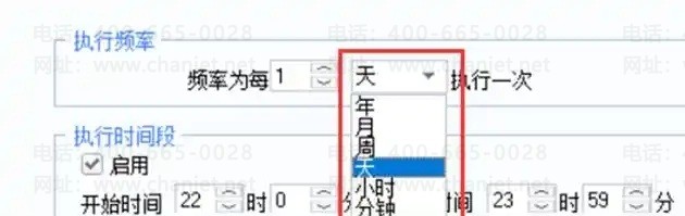 a) 执行频率:设置频率,默认为1天执行一次,选择内容为年、月、天、小时、周。