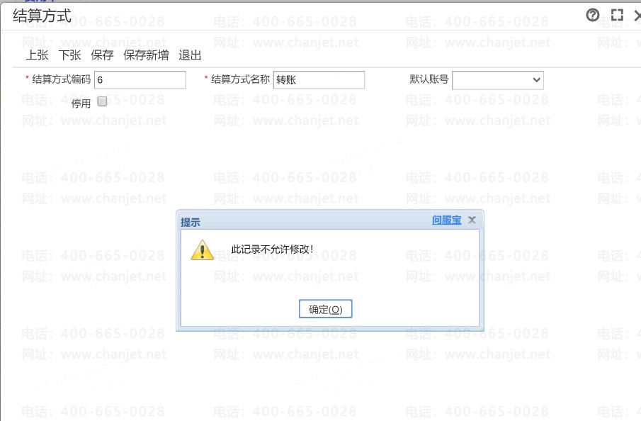 最近帮忙实施的一客户,想修改自带的结算方式 转账却提示 此记录不允许修改!