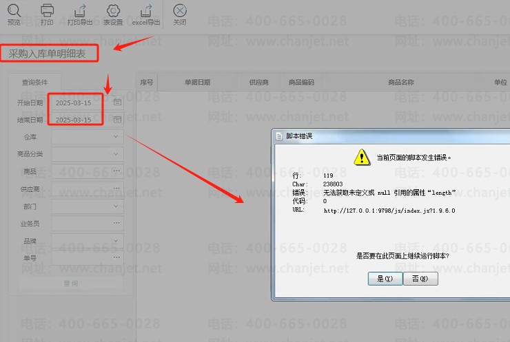 用友T1plus查询明细表提示当前页面的脚本发送错误,无法获取未定义或null引用的属性“length” 如下图