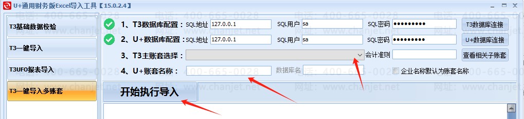 4、选择T3主账套,输入U+账套名称,开始执行导入,等待完成