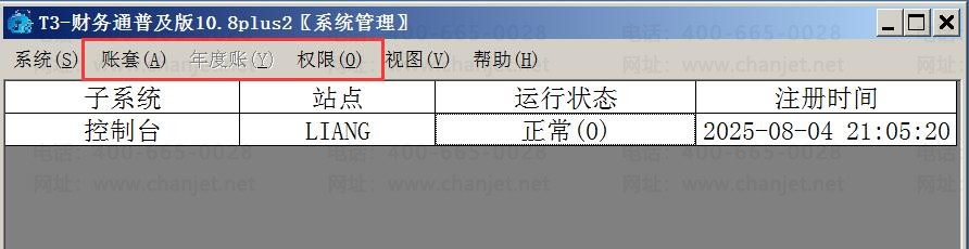 用友T3财务通普及版10.8plus2版本,又名叫用友T3财务通普及版10.8.2金盘,一切安装完成,使用admin账号登录系统管理后“账套”和”权限”都是灰色且无法操作,如下图所示