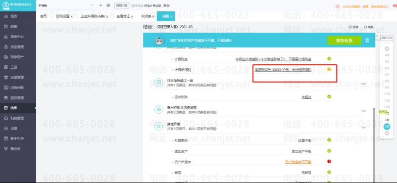 如下图所示,结账时如果提示未计提所得税时,可以根据本季度是否需要缴纳所得税去判断是否需要计提,若需要计提可以在期末结转模块补计提所得税费用,但如果截止到本季度利润总额为亏损状态,那么此提示可以忽略。