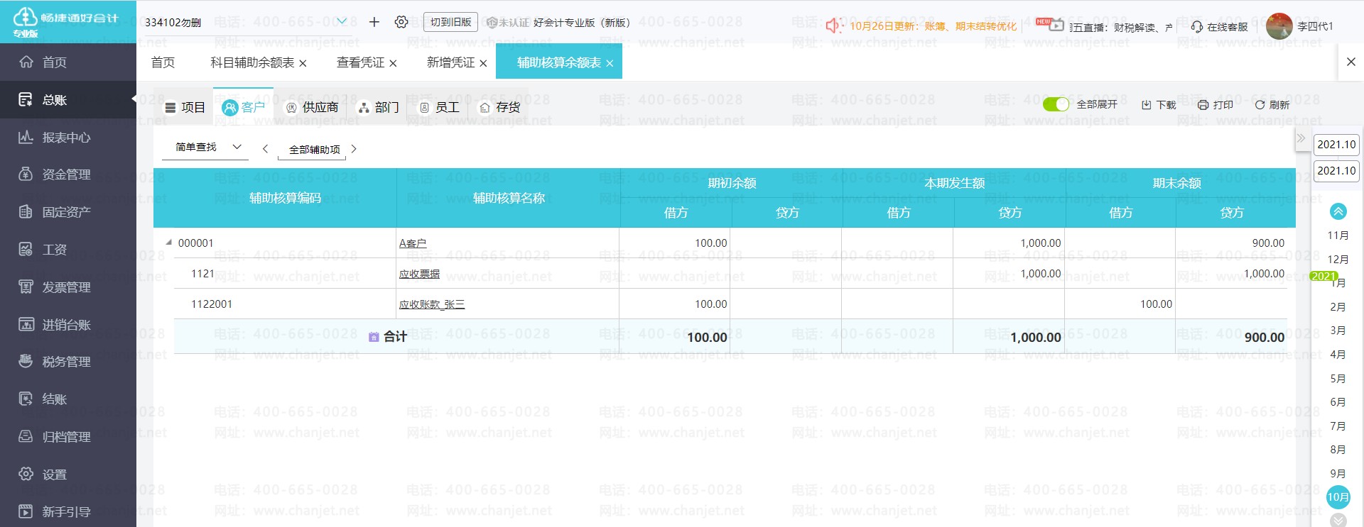 例如:某企业有100家客户,如果采用传统的明细科目,在应收账款、预收账款科目下面添加二级科目,需要分别去添加100个二级科目,一共200个,会比较繁琐,工作量大;而使用辅助核算时, 只要在应收账款、预收账款科目上勾选客户辅助核算,添加100家客户档案即可。
