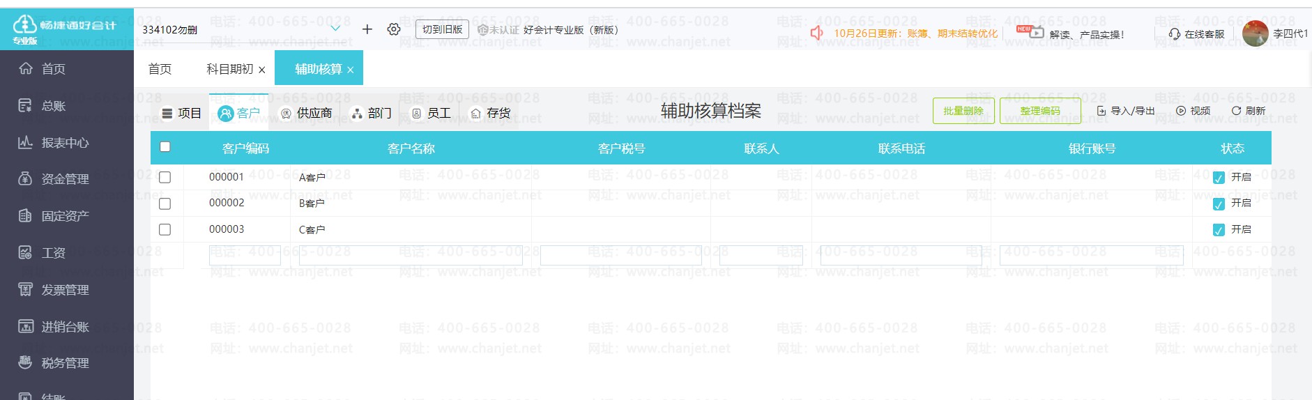 2.软件中辅助核算项目包括项目、客户、供应商、部门、员工和存货类项目。