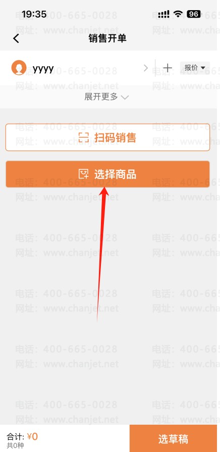2、在销货开单,选择客户之后,在点击【选择商品】,找到要赠送的商品,点进去该商品,在【填写商品信息】的界面金额字段的后面【赠品】勾选上,然后再点击【确定】即可。