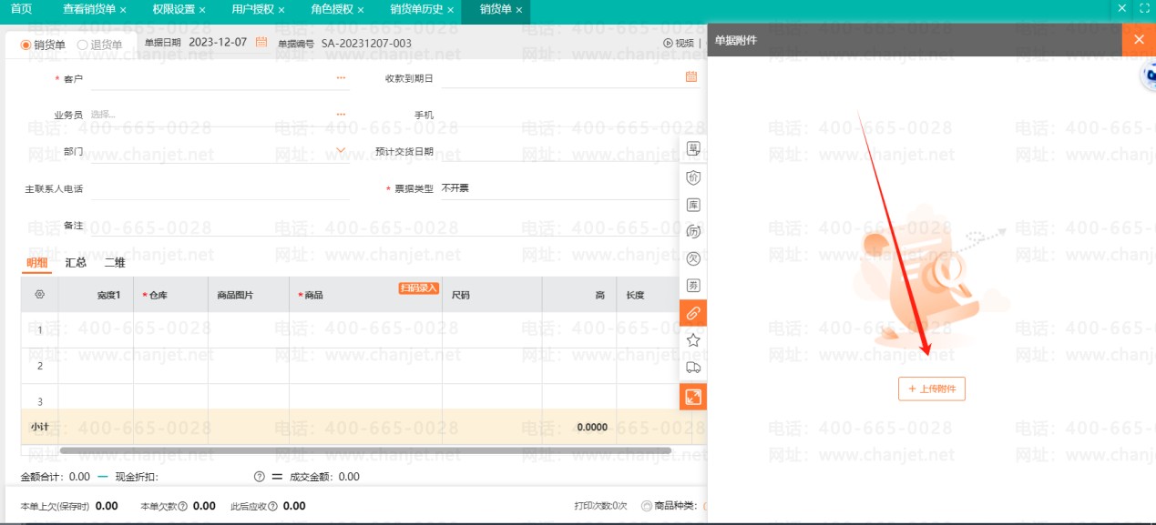 1、新增销货单时,点击右侧的回形针【】图标,把需要上传的单据进行上传。
