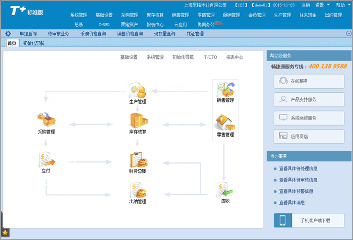 集成畅捷通云产品“工作圈”与“客户管家”,实现通知公告、业务请示、请假统计、任务协同、业务审批、报表订阅、销售进展、客户数据分析等小微企业协同OA应用及CRM应用。全新“T+云账号”,可一键登录工作圈、客户管家以及服务社区、会计家园,您可畅享多种畅捷通云端服务!